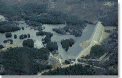 West Hill Dam Reserve is a United States Army Corps of Engineers flood control project with a recreational park and wildlife management area located at Uxbridge, Massachusetts. The West Hill Dam Project was completed in June 1961.[1] It is located on the West River, one of the branches of the Blackstone River which flows from Worcester, Massachusetts, to Providence, Rhode Island. The West River originates in Grafton, Massachusetts, at Cider Mill Pond and Silver Lake, near Upton, Massachusetts, and the Upton State Forest. The dam is unusual in that it is not filled unless there is a flood. West Hill Dam was built after devastating floods during the 1950s; it is intended to protect the Blackstone Valley from future destructive flooding. The cities and towns downriver from Uxbridge, including Millville, Blackstone, Woonsocket, North Smithfield, Cumberland, Lincoln, Central Falls, Pawtucket and Providence, Rhode Island, suffered extensive flooding from the Blackstone during Hurricane Diane in 1955. Hurricane Donna tested this new dam in 1960 as the eyewall passed over. The West Hill Dam is located in the Blackstone River Valley National Heritage Corridor near the Blackstone River and Canal Heritage State Park. Park rangers provide visitor assistance and offer scheduled interpretative programs. Fishing, hunting, and wildlife viewing opportunities are available year-round. The park has a recreation area, 34 picnic sites, one playground, a swimming area and five miles of hiking trails. However, access to the park from West Hill Road is currently blocked as of 2021 because of landowner disagreements. [2] West Hill Dam (where the Army Corps project is based) is also the field office for the Charles River Natural Valley Storage Area. It consists of scattered wetlands in the upper and middle Charles River watershed, between the towns of Bellingham and Needham. The wetlands provide flood storage area, fisheries, wildlife management, and recreation. The Charles River is the well-known watercourse that flows into Boston Harbor.