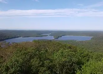View of West Lake (right), west end of Canada Lake (left), and Lily Lake (top) from the top of Kane Mountain. Dolgeville Point separates West and Canada Lakes.