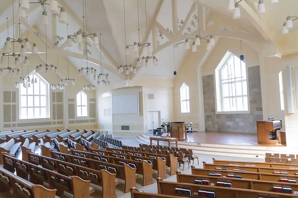 In 2010, a piece of property became available at 1025 Bunn Drive in the northeast section of Princeton, with zoning appropriate for a church. After a lengthy process of approvals, marked by some vocal opposition,[30] the congregation gained the requisite permissions to build and relocate. A new LEED certified facility of nearly 50,000 square feet was opened in December 2013. The church granted a permanent conservation easement over the wetlands on the southern third of the site, allowing for trail access to the Herrontown Woods Arboretum from Bunn Drive. With the departure from Westerly Road, a name change was deemed appropriate, and the church elders unanimously agreed upon Stone Hill Church of Princeton. The Stone Hill is a reference to the Rocky Hill Ridge on which the new building is located and the significant amount of stone that needed to be removed to allow for the foundation.[31] The original building was demolished to allow for subdivision into residential lots in accordance with the zoning. The new fellowship hall was named in honor of the Harris family, the three siblings who founded the church and donated the original land. The new prayer chapel was named in honor of Westerly and became home to the previous building's communion table and cross.