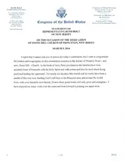 I regret that I cannot join you in person for today's celebration, but I want to congratulate the leaders and congregants on this momentous occasion in the history of Westerly Road - and now, Stone Hill - Church. In the book of Acts, Peter proclaims to the Gentiles how God anointed Jesus of Nazareth with the Holy Spirit and with power and how he went about doing good and healing the oppressed. For nearly six decades, this church and its works have been a model of this very text, heeding God's call here in the Princeton area and around the world. Now, with your beautiful new facility, I know these good works will only grow and strengthen. I have enjoyed my many visits over the years and look forward to joining you again soon.