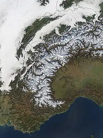 The Western Alps are the western part of the Alpine Range including the southeastern part of France (e.g. Savoie), the whole of Monaco, the northwestern part of Italy (i.e. Piedmont and the Aosta Valley) and the southwestern part of Switzerland (e.g. Valais). In the southeast the range is bounded by the Italian Padan Plain. In the west, the valley of the Rhone river separates it from the Massif Central. The northernmost part of the Western Alps - in the wide meaning of the term - is formed by the Swiss Prealps Sub-Range.