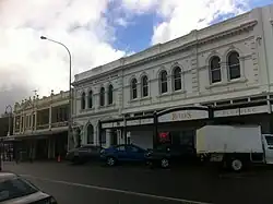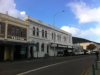 It was built in the Federation Academic Classical style and originally housed the local branch of the Commercial Bank of Australia.[1] The two storey building has many features that are identical to those of the eastern neighbouring building.[2] The building is constructed on a rusticated base, there are two entrance doors with classically derived casements made up of plain pilasters, cornices, scrolled brackets and tympanum. A pair of arched windows are found between the doors. A deep cornice was set above the entablature, there is an open balustrade at parapet level, with piers topped with urns at each end and a raised panel buttressed by scrolls and tympanum above. In 2000, the parapet level including the urns and tympanum were removed, and the entire building was painted.[2]