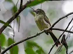 The western olivaceous flatbill was originally described in 1858 as Cyclorhynchus aequinoctialis. The author noted its resemblance to C. olivaceous, which later became the "olivaceous flatbill" (Rhynchocyclus olivaceous).[3] What is now the western olivaceous flatbill was long treated as a subspecies of that olivaceous flatbill. Following a paper published in 2016 several taxonomic systems split the olivaceous flatbill into western and eastern species though some took until 2023 to do so. By the principle of priority the eastern retained the binomial Rhynchocyclus olivaceous.[4][5][6][7] However, as of early 2025 the North and South American Classification Committees of the American Ornithological Society retain the unsplit olivaceous flatbill, though based on a 2021 publication the South American committee is seeking a proposal to split it into as many as four species.[8][9][10]
