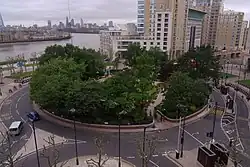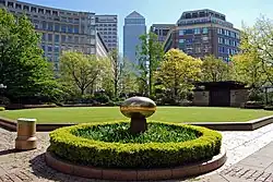 Westferry Circus is a road interchange and public space in Canary Wharf estate in London, and contains a two-level road interchange. There are two roundabouts, one above the other. It was designed by Laurie Olin .[ 1] In this context, a circus, from the Latin word meaning "circle", is a round open space at a street junction.[ 2]