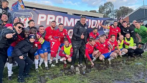 Under the name 'Westgate FC', the club began the 1987 Victorian State League Division 2 season with a 3–0 home victory against North Geelong Warriors on 28 March, Pedro Gasco (top player) scored a double.[6] In the following fixtures, Westgate were thrashed 5–1 away against Prahran City on 4 April, with Pedro Gasco again scoring.[6] By Round 5, Westgate had obtained three consecutive wins with Pedro Gasco netting in each match, totalling to six goals in five matches.[6] In Round 10, Westgate recorded their biggest ever win, a 7–1 home victory against Eltham on 30 May, Tony Marchett scored a double and Pedro Gasco also got his name on the score sheet.[6] Two fixtures later, Westgate demolished Doveton 4–0 at home on 13 June, with two goals from Pedro Gasco.[6] Gasco again scored another double in the following fixture, which saw Westgate defeat Morington 5–3 away on 20 June.[6] After suffering two defeats throughout a handful of matches, Westgate continued their winning ways with a 5–1 home victory against Hamlyn Rangers on 18 July.[6] In the following fixture, Westgate would snare off a challenge from Dandenong City in a 1–0 away victory on 25 July, the goal coming from former National Soccer League and Australian national team player Joe Picioane.[6] In Round 26, Westgate defeated Mornington 7–2 at home on 19 September, with Tony Marchett recording a total of 6 goals in the match.[6] A Round 20 fixture against Altona City was rescheduled to be played at the end of the season.[6] Prior to the fixture, Westgate were standing in third position of the Victorian State League Division 2 table, needing just 1 point in order to gain promotion to the Victorian State League Division 1.[6] A win would see them crowned champions of the entire league, topping both Mooroolbark and Sandringham City, who both sat equal on top with 37 points.[6] The match was played at Altona City's home, as they took an early lead in the match.[6] Westgate eventually finished the game winning 3–1, ending the 1987 season in first place of the Victorian State League Division 2 with 38 points, 1 point ahead of joint second placed Mooroolbark and Sandringhan City and 3 points ahead of North Geelong Warriors.[6] After just three years of experience in Victoria's stage leagues, Westgate FC gained promotion to the Victorian State League Division 1 for the 1988 season, a league in which they would serve for the next 15 seasons.[1] Pedro Gasco netted a total of 18 league goals for the club and was the leading goal scorer of the entire league. Joe Picioane was also awarded with the Best and Fairest award of the entire league.