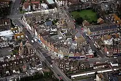 During the late 1860s, businessmen developed the area into a seaside resort for the upper to middle-classes.[3] A stretch of sea wall, with promenade on top, was constructed around the beaches at St Mildred's Bay and West Bay, and the land divided into plots to be sold for what would become an exclusive development by the sea for wealthy metropolitan families[4] within a gated community, rather than for occasional tourists.[5][6] The opening of a railway station, in 1871, led to the rapid expansion of the population,[3] which reached 2,738 by 1901.[7] The demands of the increasing population led to the building of the parish churches of St. James in 1872[8] and St. Saviour in 1884.[9] St. Saviour's was designed by the architect C.N. Beazley.[9] In 1884 it was reported that Essex, on the other side of the Thames Estuary, was hit by a tremor so large that it caused the bells of St. James' Church to ring.[10] In 1884, ownership of most of the resort passed to Coutts Bank, after the previous proprietors had gone bankrupt.[5][11]