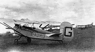The Air Ministry Light Aircraft competition began at Lympne Aerodrome, Kent on 27 September. The Widgeon, which due to the use of the Thrush engine was badly underpowered (as was the Woodpigeon), crashed during the first day of trials.[2] Despite this setback, it was clear that the Widgeon had promise and was superior to the Woodpigeon, and the damaged prototype was rebuilt with a more powerful 60 hp (45 kW) Armstrong Siddeley Genet engine as the Widgeon II. Despite its much greater weight, the new engine transformed the Widgeon, the rebuilt aircraft being almost 40 mph (64 km/h) faster.[5] The Widgeon took part in the 1926 Grosvenor Cup air race at Lympne on 18 September 1926. Its average speed of 105 mph (169 km/h) was the fastest recorded in the race, but owing to the handicapping system in place, the race was won by a Blackburn Bluebird.[6][7] The sole Widgeon II was sold in January 1928 but was destroyed in a fatal crash on 10 October 1930.[7]