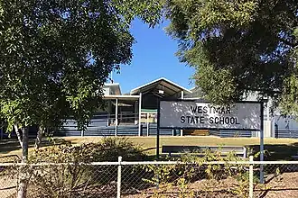 Westmar State School is a government primary (Prep-6) school for boys and girls at 18425 Moonie Highway (27°55′11″S 149°43′10″E / 27.9197°S 149.7195°E / -27.9197; 149.7195 (Westmar State School)).[12][13] In 2015, it had an enrolment of 22 students organised into 2 classes with 3 teachers (2 full-time equivalent).[14] In 2018, the school had an enrolment of 41 students with 3 teachers and 5 non-teaching staff (3 full-time equivalent).[15] In 2023, the school had an enrolment of 17 students.[16]