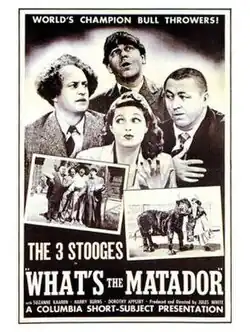 What's the Matador? is a 1942 short subject directed by Jules White starring American slapstick comedy team The Three Stooges (Moe Howard, Larry Fine and Curly Howard). It is the 62nd entry in the series released by Columbia Pictures starring the comedians, who released 190 shorts for the studio between 1934 and 1959.