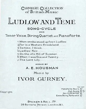 Housman’s poem was among the first to be set by composers, beginning with Arthur Somervell’s as part of his Songcycle from A Shropshire Lad and the single setting by Stephen Adams, both in 1904.[3] Two frequently performed versions are George Butterworth’s, from his Six Songs from A Shropshire Lad for medium high voice and piano (1911),[4] and Ivor Gurney’s from Ludlow and Teme (1919).[5] The style of setting varies from the simplicity of the traditional tune fitted to it by Butterworth to the “chromatically overwrought” music of Arnold Bax.[6] As of 2025, some 44 versions are currently listed on The LiederNet Archive[7] but they do not include arrangements for choir such as those by Richard Nance as part of Songs of a Young Man (1985)[8] and Robert Rhein in Three Songs from A Shropshire Lad.[9] There have also been popular versions, as in the solo performance by Michael Nesmith[10] and the group performance by the German folk group, Black Eye.[11]