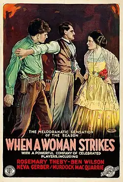When a Woman Strikes is a 1919 silent film western drama directed by Roy Clements and starring Rosemary Theby and Ben F. Wilson. An independent production there is scarce info on this pictures. It is not known whether it survives or is lost.
