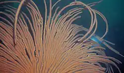 This fan is orange and has flexible whip-like branches. It may grow up to 70 cm tall and have branches of 0.3 to 0.5 cm wide.[3][4]
