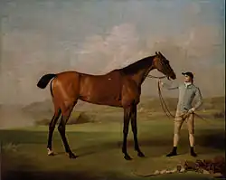 Whistlejacket was a chestnut stallion, with flaxen-coloured mane and tail, believed to be the original colouring of the wild Arabian breed. He was a Thoroughbred race horse foaled in 1749 at the stud of Sir William Middleton, 3rd Baronet at Belsay Castle in Northumberland,[23] and named after a contemporary cold remedy containing gin and treacle. His sire was Mogul and grandsire was the Godolphin Arabian; through his dam, he was also descended from the Byerly Turk, and various other Arabians and Turks. He raced from 1752, winning many races in the North. He lost to Jason in the King's Plate at Newmarket in 1755,[24] but won the following year,[25] when he was also narrowly beaten by Spectator for the Jockey Club Plate at Newmarket in 1756. He was sold soon after to the Marquess of Rockingham. He famously won a four-mile race at York in August 1759 against a strong field, beating Brutus by a length, and then retired to stud, being ten years old.[26]