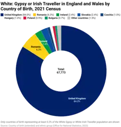 White: Gypsy or Irish Traveller is an ethnicity classification used in the 2011 United Kingdom Census. In the 2011 census, the White: Gypsy or Irish Traveller population was 63,193 or about 0.1 percent of the total population of the country. The ethnicity category may encompass populace from the distinct ethnic groups of Romanichal Travellers or Irish Travellers, and their respective related subgroupings, who identify as, or are perceived to be, white people in the United Kingdom.