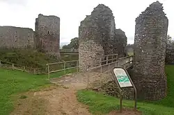 The outer ward is 320 by 170 feet (98 by 52 m) across, accessed by a gatehouse on the eastern edge and defended by a stone curtain wall, a dry ditch and four mural towers.[29] The gatehouse, which survives up to 5 metres (16 ft) in height, originally had a portcullis and a drawbridge.[30] Three of the towers were circular in design, but one was rectangular and would have been used as lodgings for a household official.[31] There was a large building, probably a barn, 115 by 66 feet (35 by 20 m) across, on the north-western edge of the ward, alongside a group of smaller buildings, but all have since been lost.[31]