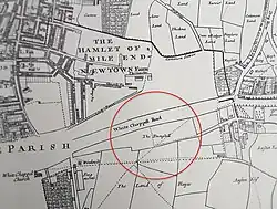 Whitechapel Mount's position is first depicted in a 1673 building plan by Sir Christopher Wren, where he refers to it as "the mud wall called the Fort".[11] In Joel Gascoyne's survey of the parish of Stepney (1703) it is called The Dunghill: it is at least 400 yards long, and is crossed not only by a path, but a road.