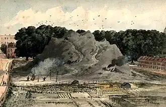 After the civil war these fortifications were swiftly removed because they spoiled productive agricultural land. However traces remained and one of these was Whitechapel Mount.[23] Wrote Lysons (1811): "The east end was till of late years very perfect; on the west side some houses had been built. The surface on the top, except where it had been dug away, was perfectly level.[22] Mount Street, Mayfair, is another relict name of one of these civil war forts.[24]