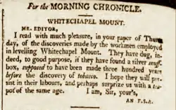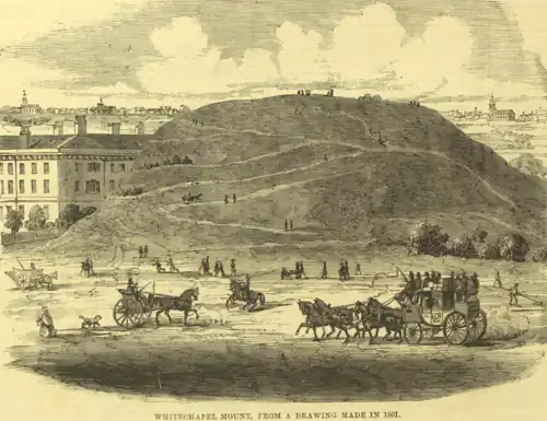 - ^ Proposals for purchasing and carying away the soil were invited in 1801: Morning Chronicle, 23 March 1801, p.1. Joseph Moser examined the strata in 1802:Moser 1803, p. 415 Work must have ceased, for The Monthly Mirror of July 1806 reported "The removal of Whitechapel Mount has commenced":Domestic Events 1805, p. 65 Bricks were still being delivered from Whitechapel Mount in 1809: R v. Hall 1809