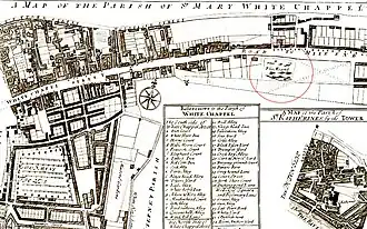 In John Rocque's map of London (1746) it has been horizontally truncated, but is shown with substantial elevation, with at least one dwelling-house – if not a terrace of houses – on its western end. In Richard Blome's map of 1755 it has a large dwelling-house with front drive and appears alongside the newly built London Hospital. In John Cary's 1795 map its western portion has been truncated by the newly built New Road, but appears to have a substantial building in its northwest corner.