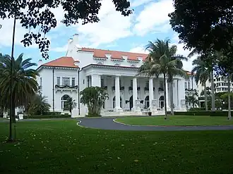 Today, Whitehall is a National Historic Landmark and is open to the public as the Henry Morrison Flagler Museum, featuring guided tours, exhibits, and special programs. The museum offers several programs, many of which are seasonal, lasting only from October to January. In addition to an annual chamber music series, the Flagler hosts the Whitehall lecture series, which brings "experts and best-selling authors to discuss Gilded Age topics, events, and local history."[9] Past lecture series include historical talks about the dawn of the Progressive Era, World War I, Gilded Age presidents, engineering feats, and Metaphysical America: Spirituality and Health Movements During the Gilded Age. The Flagler also holds a special exhibition each year, often showcasing Gilded Age paintings, sculptures, glamour photography, or material culture, such as board games, jewelry, cartoons, Tiffany & Co. silver pieces (including ones displayed at the 1893 Chicago World's Columbian Exposition), and women's fashion. It also hosts a variety of local galas and balls throughout the year. The Museum is located at Cocoanut Row and Whitehall Way in Palm Beach.