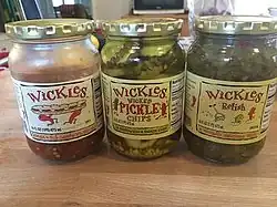 Wickles is an American food manufacturer that sells pickles. The company originated in Dadeville, Alabama.[1] Wickles offers an original sweet and spicy pickle along with other signature products in their Wicked line, such as original relish, hula relish, hula pickles, pickled okra, pickled jalapeƱos and pickled banana peppers. Wickles Dirty Dill line of products is spicy, with no sweet notes, and includes cocktail cornichons, red jalapeƱo relish, crinkle cut pickle chips, spears and whole baby dills.