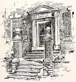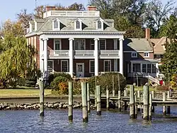 Baltimore architect Howard Sill began the renovation of Widehall in June 1910.[11][12] He removed the Victorian, mansard-roofed third story, and recreated the house's original double-hipped roof and dormers. Hubbard purchased the lot adjacent to the east, "Water Lot #15," in 1911.[6] Upon this lot was built a brick, Federal Revival, 2-story kitchen wing, designed to look as if it had been expanded in stages over time. Sill's kitchen wing solved a host of circulation problems. It featured a butler's pantry leading to the dining room, a large modern kitchen, a service stair to the wing's second floor servant bedrooms, another service stair to the house's cellar (descending beneath the first flight in the stair hall), and a hallway, cloak room and powder room accessible from the stair hall. The old kitchen ell was demolished, and Sill designed a grand, Federal Revival, two-story porch that was the full width of the river facade.[13]