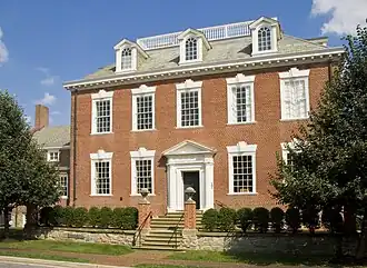 Widehall is a large, brick, 2+1⁄2-story, middle-Georgian period, city house fronting on Water Street, with the Chester River waterfront behind it.[2] It is 50 ft (15 m) wide and 41 ft (12 m) deep, and is approached by two short flights of sandstone steps, separated by a terrace.[3] The house's high basement is screened by a claire-voie of four brick piers topped by sandstone ball-finials, and a pair of boxwood hedges. Its five-bay street facade features a pedimented frontispiece with engaged columns, nine windows with oversided-quoin stone lintels, a double-hipped roof, three dormers with Welsh-arched windows, and a balustraded roof deck.