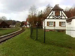 Bundenthal-Rumbach station – sometimes also called Bundenthal – is a terminus station and also the end station of the Wieslauterbahn. It is located on the northern edge of the village of Bundenthal. It had a half-timbered locomotive shed that no longer exists. Initially, it had three regular tracks and a siding in front of the station building. The tracks were later reconstructed so that, in addition to two bypass tracks in the northern station area, there was also a siding. Only one of the former still exists today.[56]