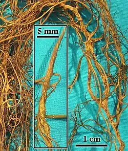 The species is currently classified as Bryoria fremontii, although it is sometimes identified by the older classification of Alectoria jubata.[4][5] Several different English names have been used for this lichen including black moss,[6] black tree lichen[7] and edible horsehair lichen.[8][9] There are names for this lichen in at least 20 different indigenous languages in North America. Wila (wee-la) is the Secwepemc language name for the lichen.[4] The Nez Perce name is hóopop and the Sahaptin name is k'ʷɨnč.