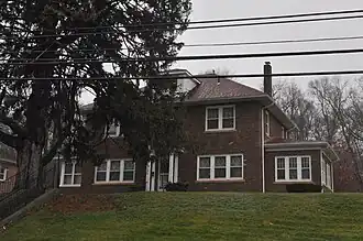The Wilfred X. Johnson House is located on Hartford's north side, on the north side of Tower Avenue between Barbour and Hampton Streets. The property's rear abuts the city's Keney Park. The house is 2+1⁄2 stories in height, built out of brick with wooden trim. It is covered by a hip roof that is pierced on the front by a shed-roof dormer. Single-story wings extend to either side of the main block. The front facade is three bays wide, with a center entrance sheltered by a gabled porch with cove ceiling. The entrance is flanked by pilasters that match the posts supporting the porch. The bays on either side of the entrance have tripled sash windows, while the upper floor bays have a 2-1-2 pattern of window grouping. The flanking wings each have tripled sash windows. Some of the windows retain their original diamond-pane sashes. The interior of the house follows a center hall plan.[2]