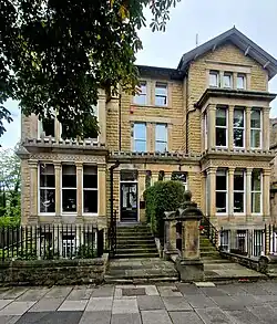 Edgecombe had two daughters and two sons, by his first marriage on 13 January 1897 to Jane Swinburne of Workington, Cumberland.[nb 6][4][12] She was the daughter of landowner John Fawcett Swinburne.[13][14] His elder daughter was doctor Dorothy Minna Edgecombe,[nb 7][15] who had a Bachelor of Medicine, Bachelor of Surgery degree,[9][16] from the University of Leeds,[17] and whose second marriage was to doctor Raphael Perlee James Rutherford,[18] brother of Kathleen Rutherford.[19] His younger daughter was magistrate Joan Edgecombe,[nb 8] director of music at the former Belmont School, 11 Queen Parade, Harrogate from 1928.[20] His two sons were Paul Swinburne Edgecombe,[nb 9][21] a Royal Naval surgeon captain,[22] and Midshipman Arthur Wilfrid Edgecombe,[nb 10][23] who was killed in action on HMS Verulam during the First World War.[24][25] In 1901 Edgecombe and his wife Jane were living with their two-year-old daughter Dorothy and three servants at 102 Station Parade, Harrogate,[26] and then 2 Royal Villas.[23] Between at least 1909 and at least 1932 the family was living above Edgecombe's surgery at 17 Victoria Avenue, Harrogate, with three servants and a governess in 1911,[21][19][18] and their two daughters and three servants in 1921.[17] By 1932 the family was living at Craven Lodge, 101 Victoria Avenue, while possibly retaining no. 17, which held the surgery.[12]