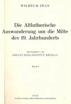 - ^ Wilhelm Iwan, Die Altlutherische Auswanderung um die Mitte des 19. Jahrhunderts: Eine Episode deutscher Auswanderung: 2 vols. (i.e. The Old Lutheran Emigration at the Middle of the 19th Century), Johann-Heß-Institut Breslau (ed.), Ludwigsburg: Eichhornverlag Lothar Kallenberg, 1943.