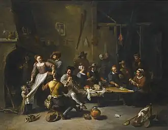 Typical examples of his work are the painting A Poor Company at Table in a Rustic Kitchen held by the National Trust at Tyntesfield and oil on copper religious paintings, such as Daniel in the Lion's Den (c. 1650, Los Angeles County Museum of Art).[3][4] In the former, a genre scene, the figures demonstrate a small-scale use of Rubensean figures in an interior reminiscent of contemporary works by David Teniers the Younger.[3]