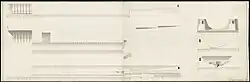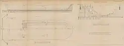 The steam frigate HNLMS Wassenaar was the first ship to use the rebuilt drydock on 26 October 1861. For the docking it had been totally emptied. Its rigging had been removed, but the masts remained in place. Boilers and machinery remained on board, which was very important. 28 tons of ballast had been put near the bow to get the keel level. Draft was then 4.44 m fore and 4.57 m aft.[30] The blocks were high 0.77 m to 1.05 m, so there was from 4.515 m to 4.935 m of water above them. There was 7.25 m of space left between the rudder axis and the inside of the lock door.[31] The maximum length of a docking ship was then estimated to be 16.45 m more, and a draft of 5.5 m would be possible at high tide.