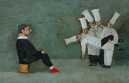 Balthazar began painting the series that he calls ‘Cooks’ in 1991. The first examples were painted on small wooden panels and usually included a larger figure sitting to one side. Often inspired by medieval painting there is a comic quality to these painting which despite their origins in religious iconography speak of humanity’s eternal role as actors on the stage of life, sometimes play acting with great humour and other times acting out the gravest of tragedies.[9] He has had solo shows alongside Howard Hodgkin and Wolf Kahn as well as group exhibitions with Alberto Sughi, Adriano Alumni, Mario Tozzi and Ottone Rosai.