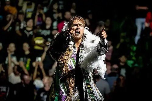 Ospreay returned to AEW on the 16 August episode of Dynamite, aiding Don Callis by attacking Chris Jericho alongside Konosuke Takeshita, before being chased off by Jericho's ally Sammy Guevara.[148] Later in the show, Jericho challenged Ospreay to a match at All In and shortly after the match was made official for the PPV. At All In, at Wembley Stadium, Ospreay defeated Jericho with the Stormbreaker.[149] Once again under the leadership of Don Callis, Ospreay teamed with Konosuke Takeshita and Sammy Guevara, who had since betrayed Chris Jericho to join Callis, to face Jericho, Kenny Omega and Kota Ibushi, in a six-man tag-team match at WrestleDream. On 1 October at the event, Ospreay, Takeshita and Guevara were victorious.[150]