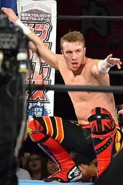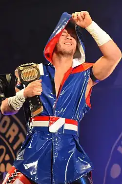 Ospreay bounced back with wins over P. J. Black, René Duprée, and Ricochet, which put him in line for a three-way match for AJ Styles' British Heavyweight Championship, which also featured Marty Scurll, where the champion retained. The following day, on 3 October 2015 he lost to New Japan Pro-Wrestling's Kazuchika Okada. Okada, impressed with Ospreay, went on to recommend him to NJPW officials. This, along with endorsements from AJ Styles and Hiroshi Tanahashi, eventually led to Ospreay being signed by NJPW.[26] In 2016 Ospreay beat Scurll and the new Cruiserweight Champion Pete Dunne in a non-title triple threat match, as well as beating Mike Bailey, which saw him earn a Cruiserweight Championship match against Dunne on 10 July which he won. The following month Ospreay headlined York Hall in a match against Vader. The feud began after Vader had criticised an NJPW Best of the Super Juniors match between Ospreay and Ricochet in May, comparing the match to "a gymnastics routine".[27] The debate escalated over Twitter, with many wrestling journalists and veterans weighing in on the debate.[28] Their match eventually took place on 12 August, with Ospreay losing to Vader after Dunne interfered while the referee was distracted. On 13 April 2017, Ospreay lost the British Cruiserweight Championship to interim champion Josh Bodom.[29] Following a non-title contest against Zack Sabre Jr at 'Monday Night Mayhem' in Portsmouth in which Ospreay won, on 10 November 2017 at Global Wars, Ospreay failed to win the Undisputed British Heavyweight Championship from Zack Sabre Jr.[30] At High Stakes on 14 February 2020, Ospreay defeated Sabre Jr. to win the Undisputed British Heavyweight Championship.[31]