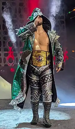 On 18 November at Full Gear, it was revealed that Ospreay had signed a multi-year deal with All Elite Wrestling, with AEW President Tony Khan touting his acquisition as a "blockbuster signing". He officially joined the AEW roster in February 2024.[151][152] Ospreay's contract allows him to reside in the United Kingdom and also make select appearances for NJPW.[153] Ospreay's first match as an AEW contracted wrestler took place on 3 March 2024 at Revolution, defeating fellow Don Callis Family stablemate, Konosuke Takeshita.[154] On 21 April at Dynasty, Ospreay defeated Bryan Danielson. This match was rated 6.5 stars by Dave Meltzer, which makes the match the second greatest match ever by his ratings, only behind Kazuchika Okada vs. Kenny Omega at Dominion 6.9.[155][156] On the 24 April episode of Dynamite, Ospreay won a Casino Gauntlet Match, to earn the right to challenge Roderick Strong for the AEW International Championship at Double or Nothing.[157] At Double or Nothing, Ospreay defeated Strong to win the International Championship, winning his first championship in AEW.[158] On the 29 May episode of Dynamite, Ospreay won his second Casino Gauntlet Match, this time to earn the right to challenge Swerve Strickland for the AEW World Championship at Forbidden Door.[159] On the 1 June episode of Collision, Ospreay successfully defended his title in his first title defense against Kyle O'Reilly.[160] On June 30 at Forbidden Door, Ospreay lost to Strickland, failing to win the AEW World Championship and suffering his first singles loss in AEW.[161] On the July 3 episode of Dynamite, Ospreay left the Don Callis Family and successfully defended his International Championship against Daniel Garcia.[162] Despite leaving The Don Callis Family, Ospreay remained aligned with member Kyle Fletcher. At Dynamite 250 on 17 July, Ospreay lost the International Championship to MJF, ending his reign at 52 days,[163] only to win the title back on 25 August at All In.[164] On 7 September at All Out, Ospreay successfully defended his title against Pac.[165] On the September 11 episode of Dynamite, Ospreay teamed with Kyle Fletcher to win a tag team Casino Gauntlet match to earn a shot at The Young Bucks' AEW World Tag Team Championship at Grand Slam on 25 September, but failed to win the titles at the event. On the fifth anniversary episode of Dynamite on October 2, Ospreay defended his title against Ricochet, however Konosuke Takeshita attacked both men causing the match to end in a no contest. On 12 October at WrestleDream, Ospreay lost his title to Takeshita in a three-way match, also involving Ricochet, ending his second reign at 48 days. After the match, Ospreay would be attacked by Kyle Fletcher, effectively ending their alliance.[166] On 23 November at Full Gear, Ospreay was defeated by Fletcher.[167] The next day, Ospreay was announced as a participant in the 2024 Continental Classic, where he was placed in the Gold league.[168] Ospreay finished the tournament with 9 points and advanced to the playoff stage on 28 December at Worlds End.[169] At Worlds End, Ospreay defeated Fletcher in the semi-finals, but lost to Kazuchika Okada in the grand finals.[170]