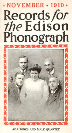 Photoportrait of singers Ada Jones (seated center) and "Male Quartet" on Edison Records catalog supplement for November 1910. Quartet of singers surrounding Jones are identified as "clockwise from bottom left: Billy Murray, John Bieling, Steve Porter, and William F. Hooley".[1]