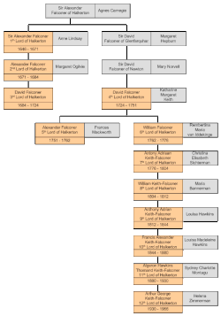 - Anthony Adrian Keith-Falconer, 7th Lord Falconer of Halkerton (d. 1804), who married Christina Elizabeth Sichterman, a daughter of Jan Albert Sichterman of Groningen, the Intendant General of the Dutch Settlements in the East Indies and Director and Fiscal of Bengal.[1]