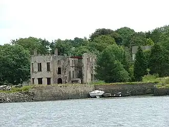 • Big House, Landshipping, Pembrokeshire. The house was originally owned by the Owens of Orielton. In 1837 William Owen added a third storey to the western wing and moved the entrance to the North facade, between two bows. These were added to look out over the River Cleddau. His design was inspired by Slebech Hall and Picton Castle.[6] The battlemented parapet is typical of Owen’s work. The house remained occupied until about 1890, by which time it had fallen into disrepair and had become a ruin. The house was purchased for restoration in 2000. The second bay was partially restored by 2012, but since then the restoration has stalled.[7]
