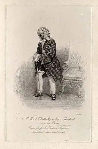 In Bath, he played such characters as Sir Anthony Absolute, Launcelot Gobbo, Foresight in 'Love for Love,' Sir Solomon Sadlips in The Double Gallant. In London, his great character was Justice Woodcock, in which he came only behind Munden and Dowton.[3] He 'created,' on 24 May 1799, the rôle of the boy in Pizarro by Richard Brinsley Sheridan. Mrs. Chatterley, who was an agreeable actress in comedy, had the reputation of being the best representative of a Frenchwoman on the English stage.[1]