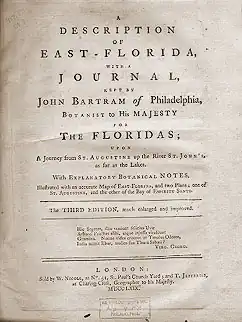 His An Account of East Florida, written in English, was published in three editions, two in 1766, subtitled "With Remark on its Future Importance to Trade and Commerce" and a third in 1769, as A description of East-Florida, subtitled "with a journal kept by John Bartram of Philadelphia, botanist to His Majesty for the Floridas : upon a journey from St. Augustine up the river St. John's, as far as the lakes : with explanatory botanical notes, illustrated with an accurate map of East-Florida, and two plans, one of St. Augustine, and the other of the Bay of Espiritu Santo", the latter referring to St. Augustine, Florida, St. Johns River, the bay now known as Tampa Bay, and the botanist John Bartram.[3]