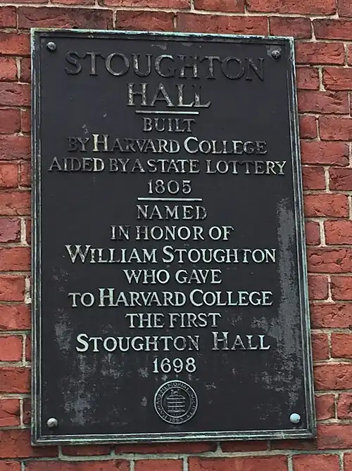 The town of Stoughton, Massachusetts, is named in his honor,[2] as is one of the Harvard College dormitories in Harvard Yard. Construction of the first Stoughton Hall, in 1698, was made possible by his £1,000 gift.[54]