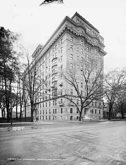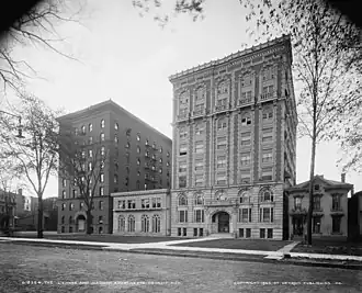 Hannan also became known as one of the leading builders of apartment buildings west of New York.[1] The apartment hotels built and owned by Hannan included the Pasadena (where he lived) and the Madison-Lenox.[11] Those three buildings were the largest and most modern apartment buildings in Detroit.[1][12] In 2004, the National Trust for Historic Preservation added the Madison-Lenox to its "11 Most Endangered Historic Places",[13] a list of buildings and locations across the United States in danger of demolition or damage due to neglect. In May 2005, the building was demolished by its owner Ilitch Holdings to make room for a parking lot. The Pasadena, an early example of upper-class, multi-unit housing, at 2170 East Jefferson Avenue, still exists and was listed on the National Register of Historic Places in 1985.[9]