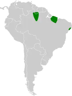 Willis's antbird has a disjunct distribution; the subspecies' ranges are significantly separated from each other. Subspecies C. l. waimiri is the westernmost. It is found in north-central Amazonian Brazil where eastern Roraima, northeastern Amazonas, and northwestern Pará meet and also into southern Guyana. The nominate subspecies is found in southeastern Amazonian Brazil, in eastern Pará and western Maranhão. Subspecies C. l. sabinoi is found in the coastal eastern Brazilian states of Pernambuco and Alagoas.[6][7]