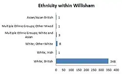 The 2011 census data shows that Willisham is predominantly a White British area of residence with 96.1% of the population describing themselves as this. The rest of the population is made up of much smaller ethnic groups which are; Other White at 2.2%, White and Asian at 0.8%, Asian British at 0.3%, White Irish at 0.3% and Other Mixed at 0.3%.
