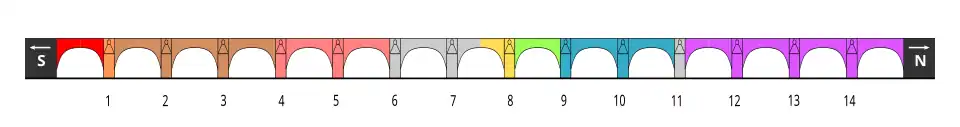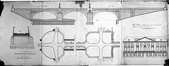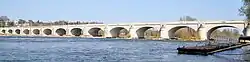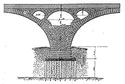 The Wilson Bridge measures 434 metres (1,424 ft) in length and 21.30 m in width, including the upstream and downstream starlings. It comprises fifteen arches, each 24.30 metres (79.7 ft) long with a rise of 8.12 metres (26.6 ft).[2][5] Supported by fourteen piers, the bridge faced criticism during construction from the engineer Jean-Rodolphe Perronet, who noted that the overly wide piers caused excessive water turbulence.[6]