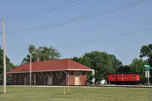 While the number of freight trains passing through town numbered five or six by 1947, the number of passenger trains declined to one local Chicago to Des Moines train, westbound-only in 1953.[4] The station was finally dropped from passenger timetables in 1954.[5] The depot received part-time freight service from 1963 to 1974, when the depot closed.