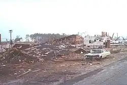 Because there were no tornado warnings before the storm (and it occurred in an area where tornadoes are rare), the initial damage reports claimed an explosion had damaged a roof.[4] Soon, however, the storm's nature and impact became apparent. Governor Ella Grasso lived just a block away from the tornado's path, though she was in Hartford at the time of the storm. She declared an 8 pm–5 am curfew in the days following the tornado.[5][11] About 500 National Guardsmen were activated to prevent looting and direct traffic, and the area was declared a disaster area by President Carter.[11] FEMA trailers were provided within a few days, and were used by many residents until reconstruction or repairs could be completed.[4][6] In all, at least 38 businesses were damaged or destroyed, 65 homes were completely destroyed, and at least 75 homes were damaged. Twenty-five tobacco sheds were "extensively damaged".[12] At the airport, at least 30 vintage aircraft were damaged or destroyed, as well as most of the state's National Guard helicopters.[9][12]